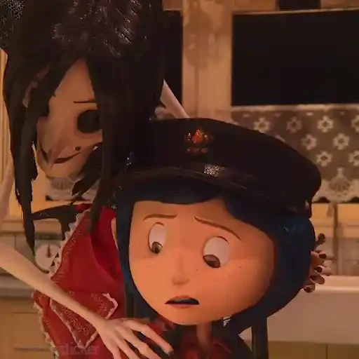 Uma cena do filme 'Coraline', com Coraline e sua outra mãe. A menina está assustada e a outra mãe sorri com um olhar sinistro.