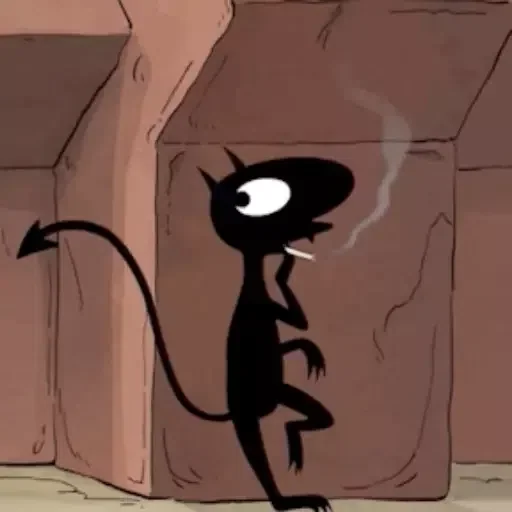 Um personagem de desenho animado, um demônio preto com chifres, cauda e olhos grandes, fumando um cigarro em frente a uma parede de pedra.