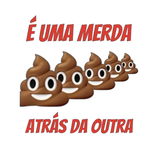 Seis fezes sorridentes com olhos grandes e texto 'É UMA MERDA ATRÁS DA OUTRA' em vermelho.