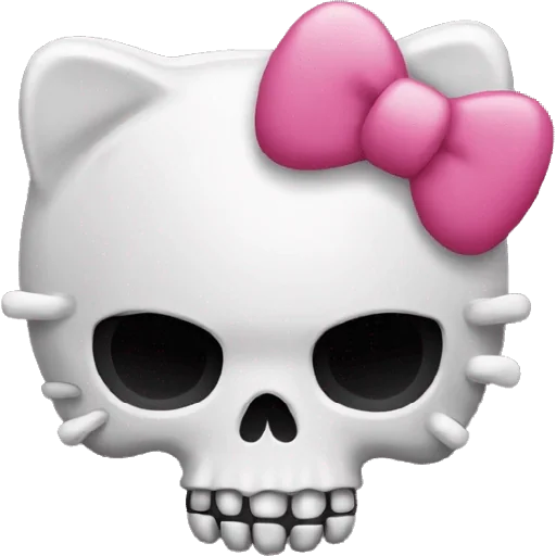 Uma caveira branca com orelhas de gato e um laço rosa. A caveira tem olhos pretos e um sorriso.