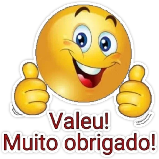 Um emoji amarelo sorridente com as mãos levantadas em aprovação, acompanhado das frases 'Valeu!' e 'Muito obrigado!' em vermelho.