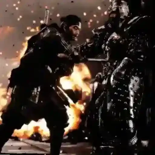 Dois homens em armaduras lutando em frente a um incêndio, com chamas laranjas e faíscas ao fundo.