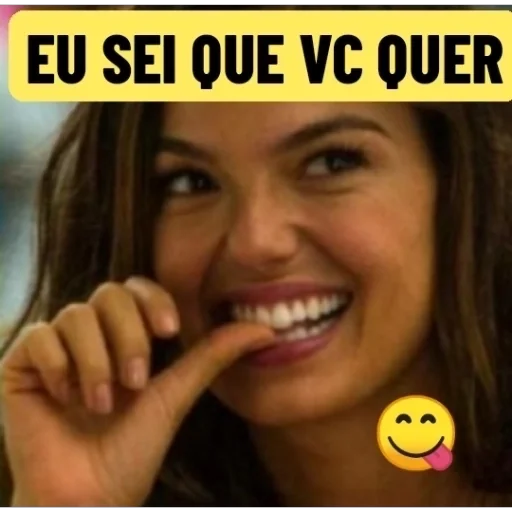 Uma mulher sorrindo e fazendo um gesto com o dedo na boca, com uma faixa amarela na parte superior com o texto 'EU SEI QUE VC QUER' e um emoji de sorriso com a língua para fora no canto inferior direito.
