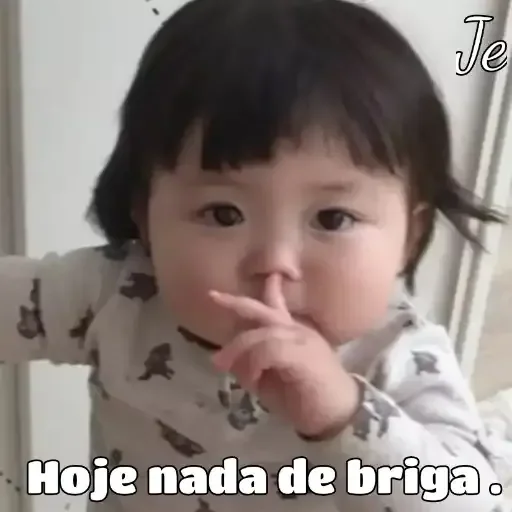 Menina pequena com franja, fazendo careta e dedo na boca, com a frase 'Hoje nada de briga.'