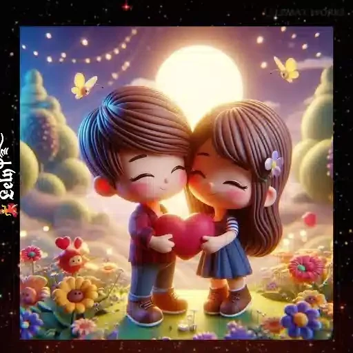 Um casal de crianças fofas com as bochechas rosadas e olhos fechados, segurando um coração vermelho em um campo de flores sob a lua cheia. O menino tem cabelo castanho e veste uma camisa vermelha, enquanto a menina tem cabelo castanho longo e uma flor no cabelo.