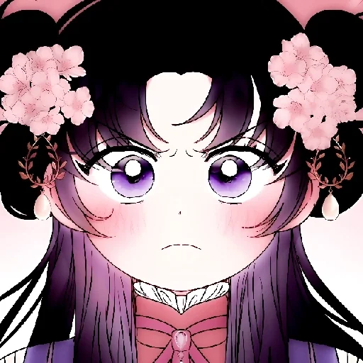 Garota de anime com expressão séria, olhos roxos, flores rosa no cabelo e roupa roxa.