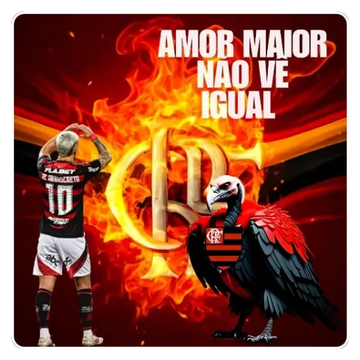 Um jogador de futebol em uniforme preto e vermelho ao lado de um abutre com as mesmas cores, com chamas e um símbolo ao fundo. O texto 'AMOR MAJOR NAO VE IGUAL' aparece em destaque.