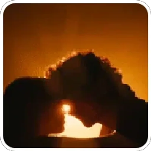 Dois cachorros se beijando ao pôr do sol com uma vela acesa entre eles.