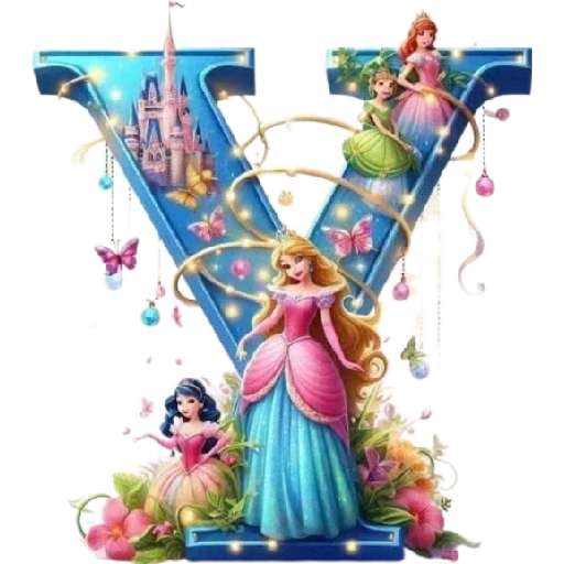 Letra Y decorada com princesas de contos de fadas, castelo, borboletas e flores coloridas. A princesa principal tem cabelo loiro e veste rosa e azul.