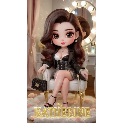 Uma boneca de estilo cartoon com cabelo castanho e um vestido preto sentada numa cadeira, com o nome 'KATHERINE' em letras douradas abaixo.