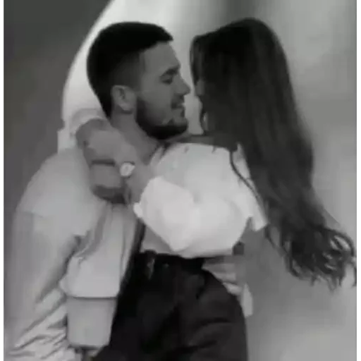 Um casal se beijando, o homem tem cabelo curto e barba, veste uma camisa clara e calça escura, enquanto a mulher tem cabelo longo e veste uma blusa clara.