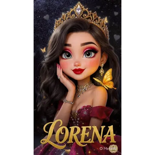 Uma princesa com coroa dourada, vestido vermelho e cabelo castanho. Ela está com a mão no rosto e um fundo escuro com borboletas.