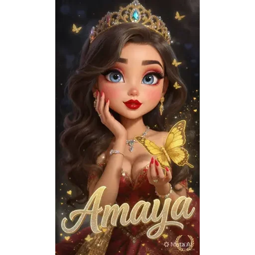 Uma princesa de olhos azuis e cabelo castanho, usando uma coroa dourada e um vestido vermelho, com a mão no rosto e uma borboleta amarela no ombro. O nome 'Amaya' está escrito em letras douradas.