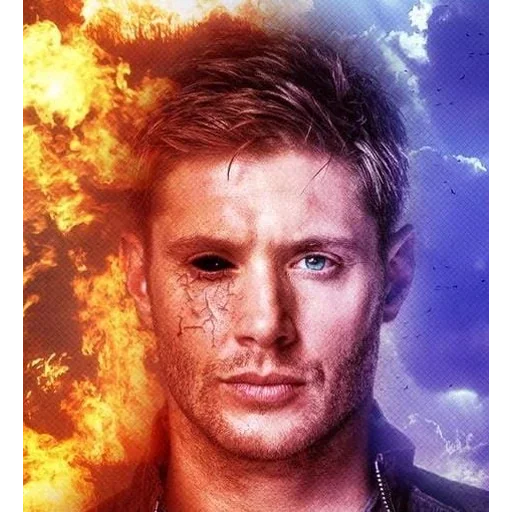 Rosto de um homem com metade do lado esquerdo com chamas e a metade direita com céu azul e nuvens, com lágrimas no rosto.