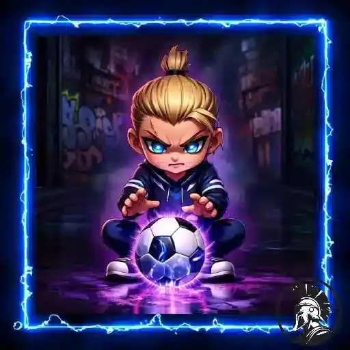 Menino de cabelos loiros com expressão séria, mãos estendidas em direção a uma bola de futebol com efeito roxo. Ele está usando um casaco preto com listras brancas.