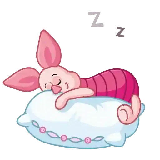 Um porco rosa de orelhas grandes está deitado em um travesseiro azul, dormindo. Ele tem um 'Zz' cinza acima dele.