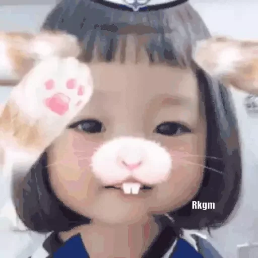 Menina com filtro de coelho, mostrando a pata do animal e com um dente de leite.