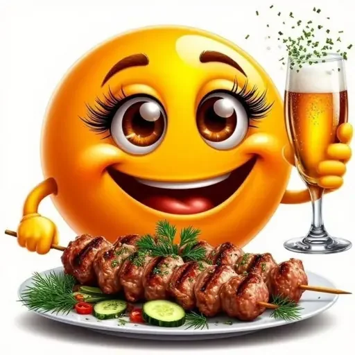 Um emoji amarelo sorridente com cílios postiços e maquiagem, segurando um espetinho de carne e uma taça de cerveja espumante.