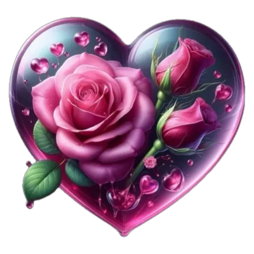 Um coração rosa com uma rosa grande e duas rosas menores, rodeado de pétalas de rosa.