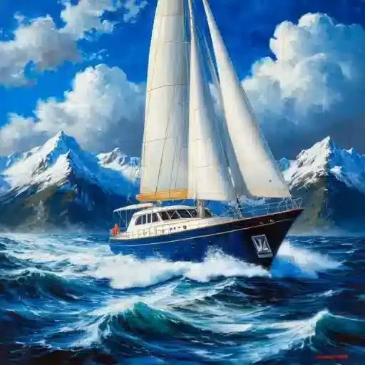 Um veleiro azul e branco navega em mar agitado com montanhas nevadas ao fundo, sob um céu azul com nuvens brancas.