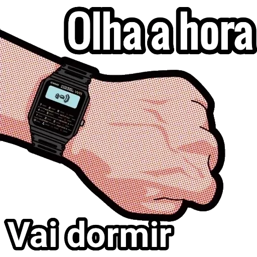 Mão com relógio preto mostra tela com hora, punho cerrado. 'Olha a hora. Vai dormir'.