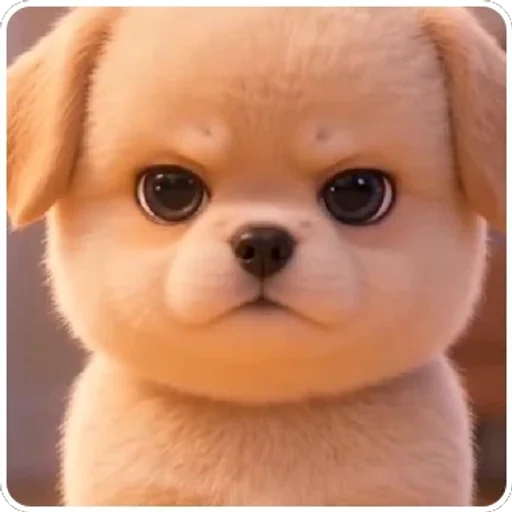 Um cachorro filhote de cor bege com olhos grandes e pretos e focinho preto, parecendo triste ou confuso.
