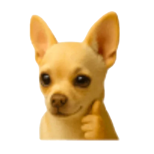 Cachorro Chihuahua com a língua de fora e a mão levantada em um gesto de aprovação.