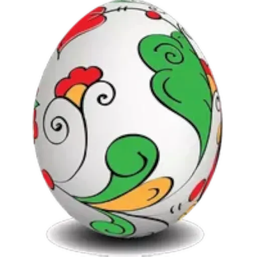 Uma esfera branca decorada com um desenho de galo colorido, incluindo verde, vermelho, laranja e preto.