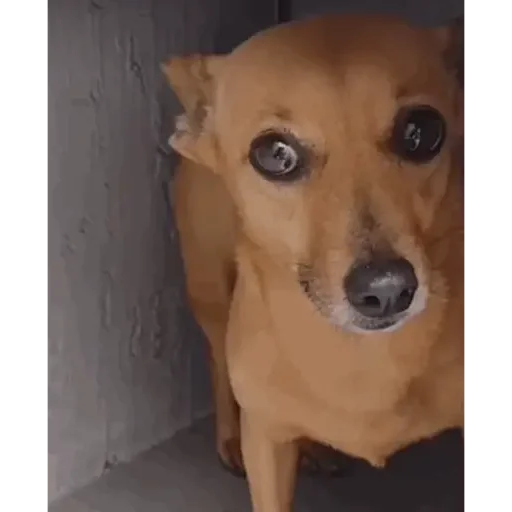 Cachorro castanho com olhos arregalados e focados na câmera, com fundo cinza.