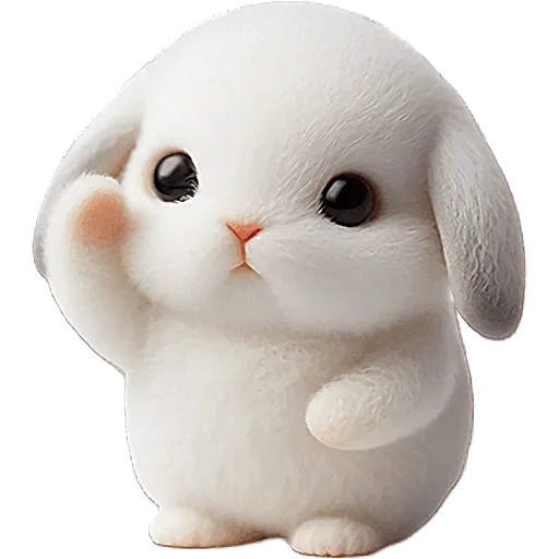 Um coelho branco fofinho com olhos pretos grandes e orelhas longas, fazendo um gesto com a pata.