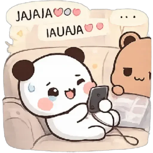 Dois ursinhos fofos, um branco e um marrom, sentados no sofá. O ursinho branco está com um celular na mão e parece chorar enquanto o ursinho marrom olha para ele com expressão triste. Há um balão de fala com 'JAJAIA IAUAJA' e corações.