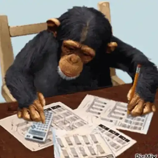Um macaco sentado à mesa, fazendo contas com uma calculadora e um lápis, enquanto olha para papéis espalhados.