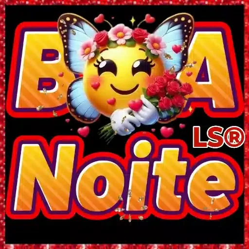 Uma abelha com asas de borboleta e flores na cabeça sorri, segurando flores, em frente às letras 'BÔA Noite' com um contorno vermelho e um fundo preto.