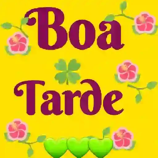 Um cartão com 'Boa Tarde' em letras grandes roxas, flores rosadas e folhas verdes em um fundo amarelo, com dois corações verdes no fundo.