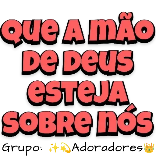 Uma figurinha com o texto 'Que A Mão De Deus Esteja Sobre Nós' em letras grandes e vermelhas com contorno preto, em um fundo branco. Abaixo do texto, há a palavra 'Grupo:' seguida de emojis e o texto 'Adoradores'.