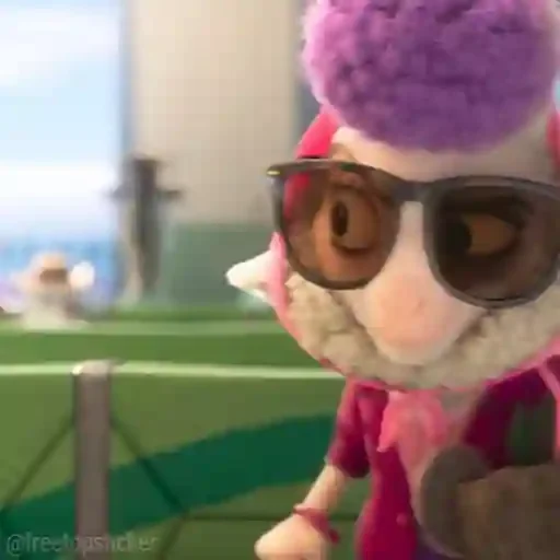 Personagem de anime com cabelo rosa e roxo, óculos de sol e camisa rosa, parecendo relaxado.