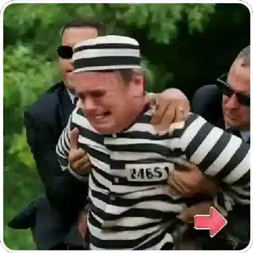 Um homem vestido de prisioneiro sendo levado por dois homens, um deles de óculos escuros. A camisa do prisioneiro tem o número 3452.