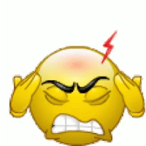 Emoji amarelo com dor de cabeça, mãos na cabeça e raio vermelho indicando dor, olhos fechados e expressão de sofrimento.