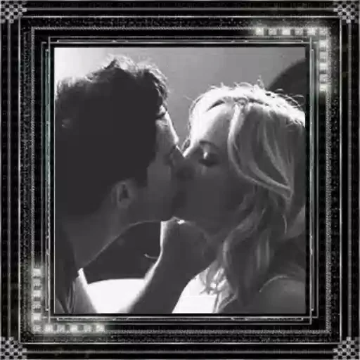 Um casal se beijando em preto e branco, enquadrado em uma moldura decorativa.