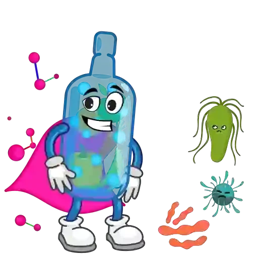 Um desenho de uma garrafa de água com expressão de dor de estômago, usando uma capa rosa e com moléculas ao redor.