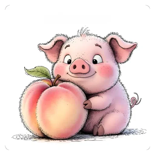 Um leitão fofinho com orelhas grandes e rosadas, e bochechas cor-de-rosa, está sentado ao lado de duas maçãs grandes e maduras.