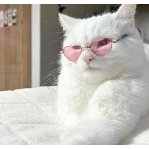 Gato branco usando óculos de sol rosa com moldura em forma de coração, com expressão facial relaxada.