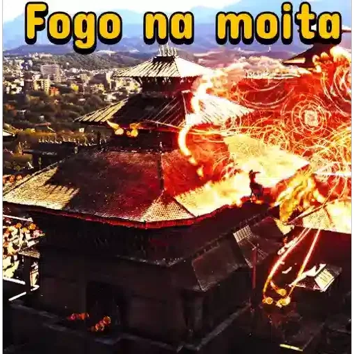 Uma cidade com prédios e montanhas ao fundo, com uma grande chama vermelha e laranja saindo de um dos prédios. O texto 'Fogo na moita' aparece em amarelo na parte superior.