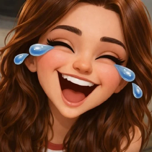 Uma mulher com cabelos castanhos e olhos fechados, sorrindo com lágrimas de alegria azuis nos olhos.