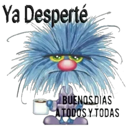 Um monstro azul com expressão séria e uma xícara de café na mão, com o texto 'Ya Desperté' e 'BUENOS DIAS A TODOS Y TODAS' sobreposto.