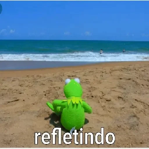 Um boneco de pelúcia do Kermit, de costas, sentado na areia de uma praia, com o texto 'refletindo' abaixo. O céu é azul e o mar está calmo.