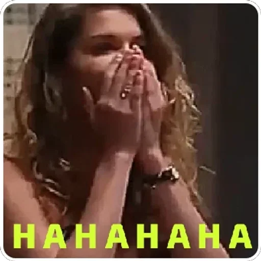 Mulher com as mãos no rosto e expressão de alegria, com o texto 'HAHAHAHA' em amarelo na parte inferior.