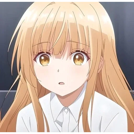 Garota de anime com cabelo loiro e olhos castanhos, vestindo uma camisa branca, com uma expressão surpresa ou confusa.