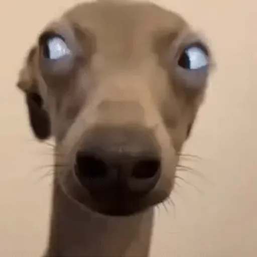 Um cachorro com olhos arregalados e expressão surpresa, focinho preto e orelhas caídas, contra um fundo bege.