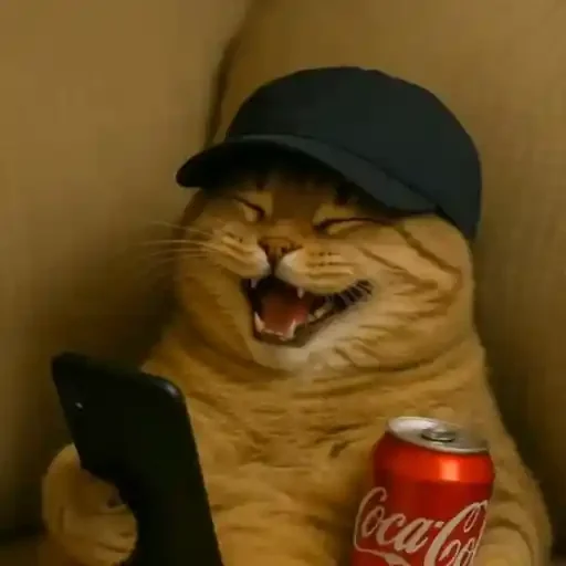 Gato laranja com um boné preto, sorrindo e olhando para um celular, com uma lata de Coca-Cola ao lado.